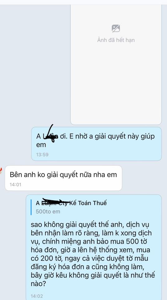 Sự cố em gặp phải từ đây, em tốn hơn 50trieu bao gồm chi phí nộp phạt, dịch vụ để có thể mở mã số thuế lên. Chị cán bộ quản lý thuế công ty em tạm gọi chị T. Lúc lên làm việc để xin mở lại MST, chị T giới thiệu 1 công ty chuyên kế toán thuế để hỗ trợ làm dịch vụ giấy tờ. Tạm gọi công ty này là AT. Ban đầu làm việc trực tiếp với anh L là sếp để bàn giao ảnh vui vẻ lắm, nhận tiền thì đòi liên tục, sau bàn giao lại cho nhân viên, thái độ rất khác, kiểu như mình phải theo bên đó, lúc này em thấy kì kì rồi. Mình thì không rành về luật, mới nhờ đến mà bên AT lại k tư vấn kỹ cho mình. Sau nhiều lần trao đổi thì mình thấy không phù hợp làm việc và bên đó trả hồ sơ cty về cho mình. Lúc làm hồ sơ mở mã số thuế, đổi địa chỉ kinh doanh, mình tưởng bên AT đã làm thủ tục đổi địa chỉ luôn cho mình rồi, vì đợt đó mình phải lên phường để xin xác minh, và phường cũng đến tận công ty để xác minh. Nhưng không, AT chỉ làm đến bước khôi phục mã số thuế mà không làm tiếp. Thậm chí việc nhận mua hoá đơn điện tử, chữ ký số cũng không làm đúng trách nhiệm: thu tiền 500 tờ mà mua có 200 tờ, nộp mẫu hoá đơn không được duyệt cũng k xử lý, nhắn tin trả lời là anh không hỗ trợ em nữa, ngang ngược vậy luôn. Thì thử hỏi sao mình dám làm việc tiếp.